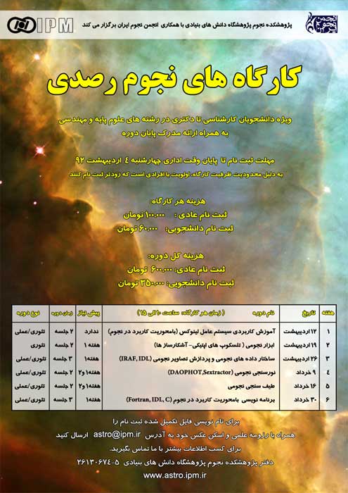 مرکز دانشهای بنیادی مدتی است فعالیتهای خود را در قالب کارگاه، کنفرانس و مدرسه پیشرفته گسترده تر کرده و پذیرای دانشجویان و علاقه مندان بیرون از این مرکز نیز هست. برای اطلاعات بیشتر به لینک زیر مراجعه کنید. فرصت ثبت نام دانشجویان و علاقهه مندان واجد شرایط روز ۴ اردیبهشت به اتمام رسیده است. ولی میتوانید جهت اطلاع دقیق از باز بودن احتمالی ثبت نام، با بخش اجرایی این دوره تماس بگیرید:
