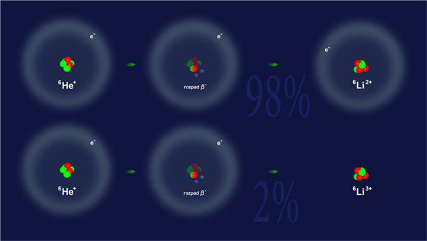 واپاشیهای هستههای اتم منابع پتانسیل اطلاعات در پدیدههای بنیادی دنیای کوانتمی هستند. متاسفانه بسیار سخت است که مدلی برای چنین فرایندی بسازیم. فیزیکدانان مرکز تحقیقات هستهای مذکور(NCBJ) با موفقیت شبیهسازی انجام دادند که درفرایند نوترون به پروتون در هلیم 6 یونیزه، دقیقاً دخالت آن را بر مدار اتمی تک الکترون نشان میداد. محسبات نظری هم این مسئله را تأیید میکند. هستهی یون هلیم 6 ترکیبیست از دو پروتون و 4 نوترون. در یک تک یون هستهای یک الکترون مداری داریم. نوترونهای اضافی چنین هستهای را ناپایدار میکنند. پروفسور زیگمونت پاتیک دراین باره میگوید:«در حین واپاشی بتای منفی، الکترون مداری به دو دلیل تحت تأثیر قرار میگیرد. اول اینکه، بار کُل الکتریکی هسته تغییر میکند، زیرا سه پروتون در فضای اشغال شدهی، دو پروتون ظاهر میشوند. دو اینکه، الکترون گسیلی با بار منفی، حرکتی نزدیک مدار اصلیاش خواهد داشت. شاید یکی بگوید، خب این واقعاً تکان بسیار قوی است».