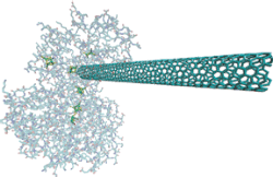 شکل 1 - مدل مولکولی سیمی ثابت میکند که چرا یک نانولولهی کربنی با مناطق کاتالیستی هیدروژناز (سبز رنگ) در ارتباط قرار میگیرد و بدینترتیب به جریان ورودی و خروجی الکترون در آنزیم کمک میکند. |
