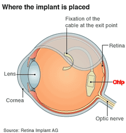 دانشمندان موفق شدند با کاشت تراشهای پشت شبکه افراد نابینا و مبتلایان به بیماریهای شبکیه، پرتوهای نور را به علایم الکتریکی تبدیل کنند و با ارسال آنها به مغز، چشم نابینایان را به جهان باز کنند.