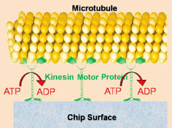 ابزارهای «میکروفلوییدیکس» (Microfluidic) جهت ارزیابی جریان مایع در ساختارها و کانالهایی با نظر کمتر از یک میلیمتر کاربرد دارند و بیشتر جهت تشخیصهای از راه دور بهکار میروند. بهکارگیری موتورها باعث مخلوط شدن مایعها و نقل و انتقال آنها در درون ابزارها میشود. از «ای تی پی» (Adenosine Triphosphate) (ATP) برای تأمین انرژی موتورهای «میکروفلوییدیکس» برمبنای «پروتئین کاینزین» (Kinesin) استفاده شده است. این پروتئین با مصرف «ای تی پی» (Adenosine Triphosphate) (ATP) حرکت میکند.
