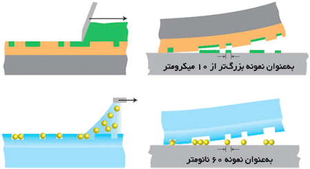 | - آرایش دقیق نانوبلورها درک فرایند آرایش و طراحی مناسب هندسهی صفحهی چاپ | | - کنترل انتقال ذرات بهسوی محلهای آرایش روی صفحه فراهم آوردن مقدار مورد نیاز نانوذرات کافی نیست و غلظت نانوذرات باید بهصورت موضعی نیز بالا باشد تا بهرهی بالایی بهدست آید | | - تنظیم چسبندگی ذرات برای انتقال مؤثر یک لایهی نازک پلیمری، نانوبلورها را در محل مورد نظر تثبیت میکند. |