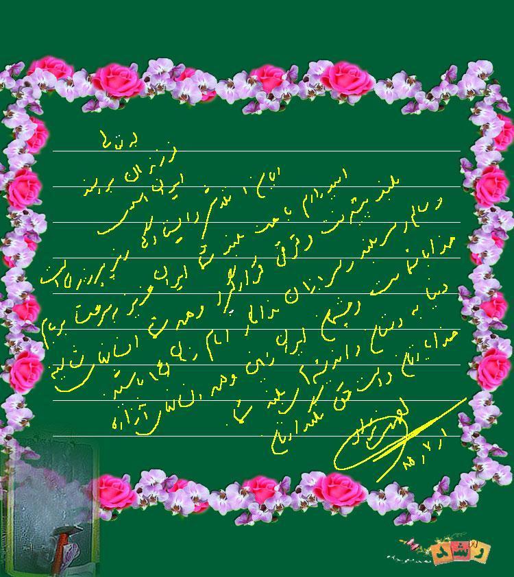 امیدوارم با همت بلند شما ایران عزیز به سرعت بر بام بلند پیشرفت و ترقی قرار گیرد و همه شما انسانهای شایسته و سالم و سربلند و سربازان فداکار امام زمان (عج) باشید.