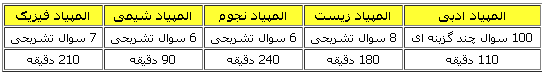 جدول تعداد سوالات و زمان آزمون المپیادهای علمی در رشته های گوناگون از روز سوم برگزاری المپیادهای علمی در سطح کشور به شرح زیر به اطلاع میرسد: