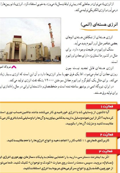 وی ادامه داد: در بحث انرژی هسته ای نیز درباره انواع انرژیها صحبت شده و سپس به فعالیتهای کشورمان در این زمینه اشاره شده است.