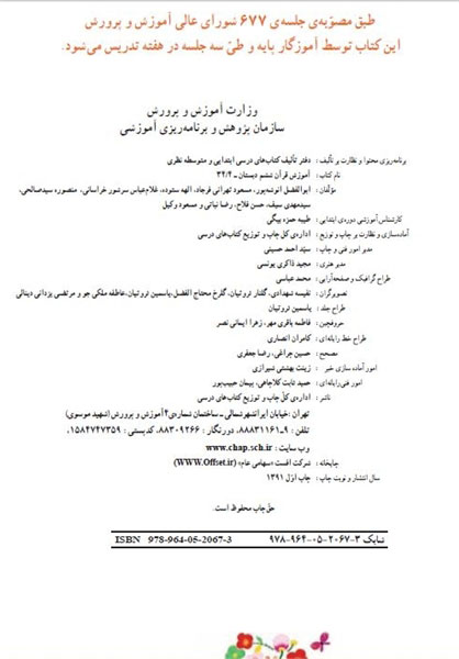 به گزارش خبرنگار اجتماعی باشگاه خبری فارس «توانا»، دروس پایه ششم ابتدایی شامل قرآن (3ساعت)، تعلیمات دینی و اخلاق (2 ساعت)، زبان و ادبیات فارسی (5 ساعت)، مطالعات اجتماعی و آداب زندگی(3ساعت)، ریاضیات (4 ساعت)، علوم تجربی (2 ساعت)، هنر (2 ساعت)، سلامت و تربیتبدنی (2 ساعت)، تفکر و پژوهش (یک ساعت) و کار و فناوری (یک ساعت) است.