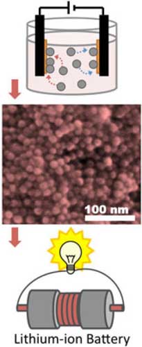 نانوذرات به طور گستردهای به عنوان کاتُدهای و آنُدهای فعال در باطریهای یون لیتیم در تمام ابزارهای الکترونیکی مورد استفاده قرار میگیرند. برای استفاده از نانوذرات کلوئیدی (تصویر بالا)، ضروری است که آنها را با رسانای کربنی که موجب افزایش رسانش و بافتهای پلیمری میشود، ترکیب کنیم. این فرایند اضافه کردن وزن اضافی به باطری را میطلبد، و مدل ساهتن برای یونهای لیتیمی و الکترونها، دشوار است. رابینسون و گروهش در دانشگاه کُرنل ایلات متحده، این روش را پیاده سازی کردند و متوجه شدند جریان قویتری تولید میشود.
