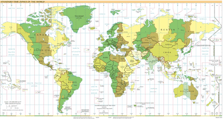 مبنای ساعتهای متداول، مدت زمان چرخش زمین حول محورش است که 24 ساعت در نظر گرفته میشود (البته واقعیت امر این است که زمین هر 23 ساعت و 56 دقیقه و 4 ثانیه یک بار به دور خودش میگردد، ولی چون هر شبانهروز قراردادی را 24 ساعت درنظر گرفتهایم، ستارگان که در آسمان ثابتاند، در هر شبانهروز 4 دقیقه زودتر طلوع میکنند). برای سهولت در کار تبدیل ساعتها، زمین به 24 قاچ مساوی تقسیمبندی میشود که عرض هر قاچ 15 درجه یا معادل یک ساعت است. بنابراین وقتی در گرینویچ ظهر است، برای مکانی در 15 درجهای شرق آن، ساعت 1 بعدازظهر است.