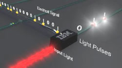 در بین این مبدلها، «مدولاتور آی. بی. ام.» صد تا هزار برابر کوچکتر از اندازهی مدولاتورهای قبلی است و استفاده از آن موجب کاهش قابلتوجه هزینه، مصرف انرژی و تولید حرارت شده و پهنای باند ارتباطی بین پردازشگرها نیز نسبت به تراشههای سیمی تا بیش از صد برابر افزایش مییابد. این کار پیشرفتی اساسی در زمینهی کاربرد فناوریهای نانو روی تراشهی سیلیکونی بهشمار میآید و هماکنون متخصصان سعی دارند تا تعداد بیشتری از این پردازشگرها را کنار هم و روی یک تراشه جای دهند. پردازشگر پیلی «آی. بی. ام.» (IBM) مورد استفاده در «پلیاستیشن سونی 3» Playstation 3 سونی، یکی از پیشرفتهترین تراشههای دنیاست که نهتنها پردازشگر دارد که روی یک تراشه قرار گرفته است. در این روش ابتدا یک پرتو لیزر ورودی به این مدولاتور اپتیکی رسیده و این مدولاتور همانند یک شاتر بسیار سریع روی آن عمل میکند و به این شدت، پرتو لیزر ورودی مدوله شده و جریان بیتهای دیجیتالی (یا همان صفر و یکها) به پالسهای نوری تبدیل میشوند. |