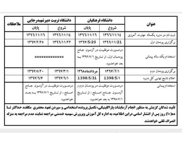 تذکر: مهارت آموزان دوره یک‌ساله دانشگاه فرهنگیان در صورت موفقیت در پودمان اول، به‌صورت موقت یک‌ساله از تاریخ ۱ مهر ۹۷ به بعد، به استخدام پیمانی در خواهند آمد استخدام قطعی پیمانی آنان بعد از موفقیت در پودمان دوم و آزمون اصلح از ۱ مهر ۹۸ به بعد خواهد بود.