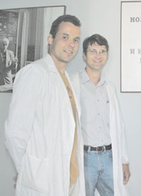 تنها دو اتم یکصد و دوازدهم برای «رابرت ایچلر» (Robert Eichler) (سمت چپ) و «روگارد درسلر» (Rugard Dressler) (سمت راست) از مؤسسهی «پائول شریر» (Paul Scherrer) برای نشان دادن خواص شیمیایی «آکتینیدهای واسطه» کافی بود |