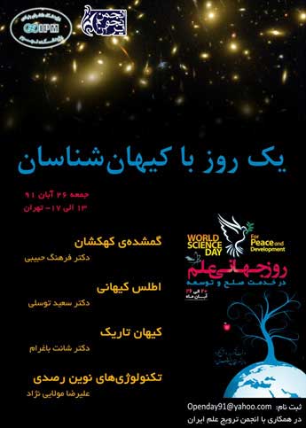 پژوهشکده نجوم پژوهشگاه دانش های بنیادی برنامه یک روز با کیهانشناسان را به مناسبت هفته جهانی علم و با همکاری انجمن ترویج علم و انجمن نجوم ایران در تهران برگزار کرد. این برنامه شامل سخنرانیهای گمشده کهکشان (دکتر فرهنگ حبیبی) در مورد مادهی تاریک و جرم کهکشانها، اطلس کیهانی (دکتر سعید توسلی)، کیهان تاریک (دکتر شانت باغرام) در مورد ماده و انرژی تاریک و تکنولوژیهای نوین رصدی (علیرضا مولایی نژاد) بود.